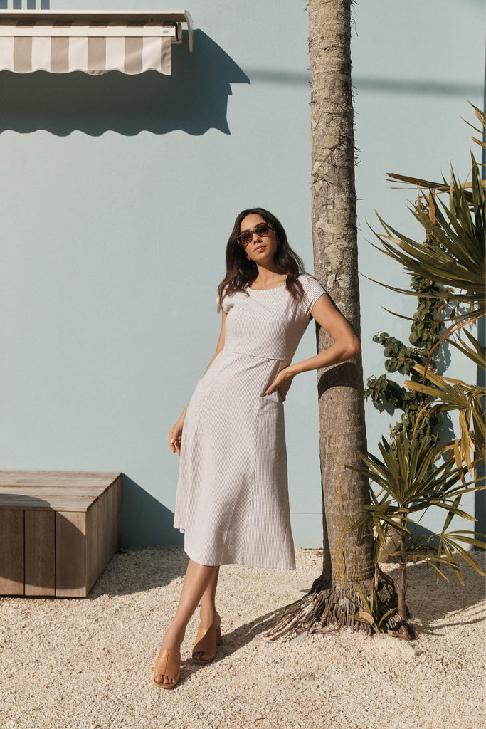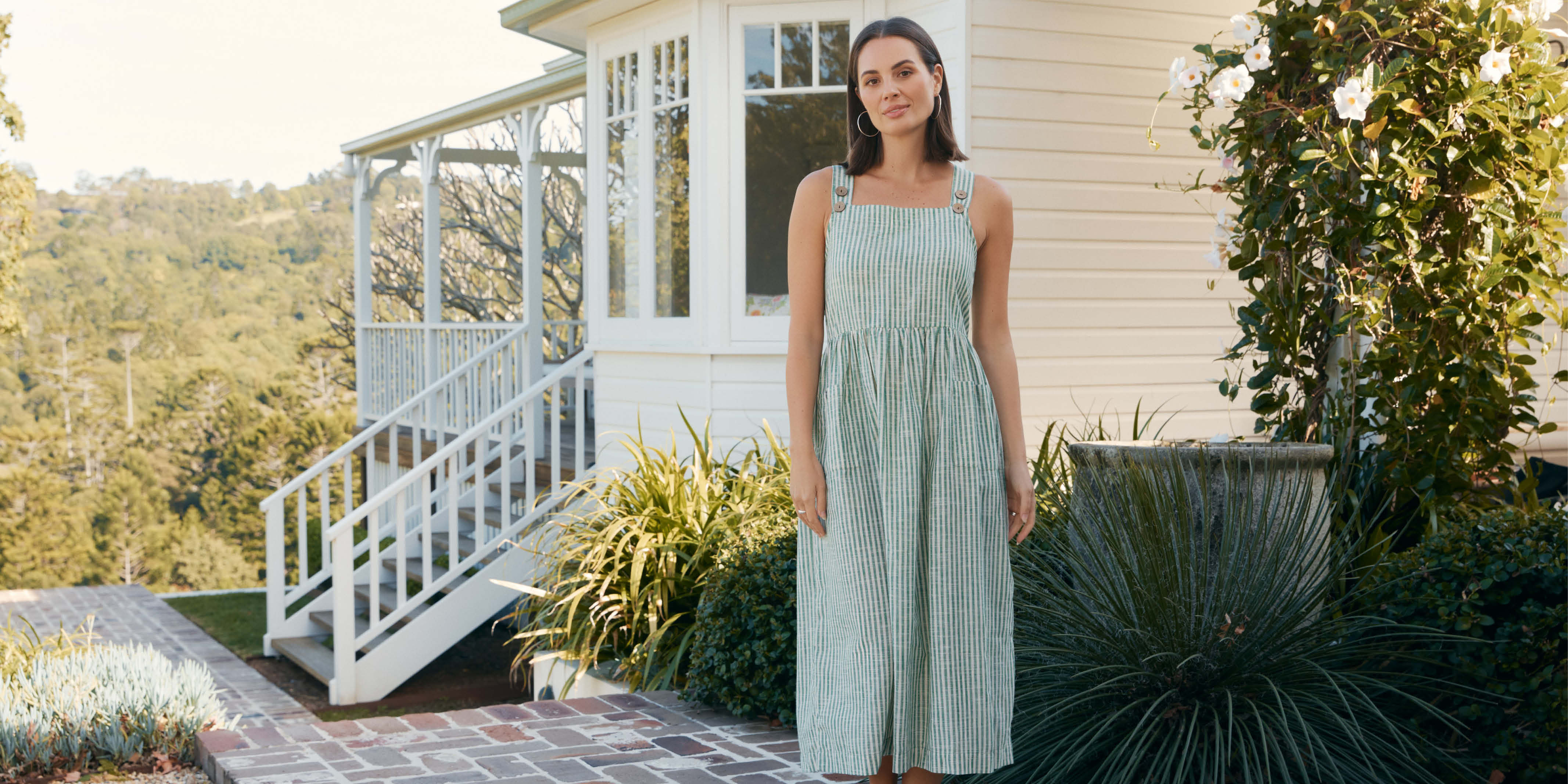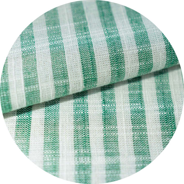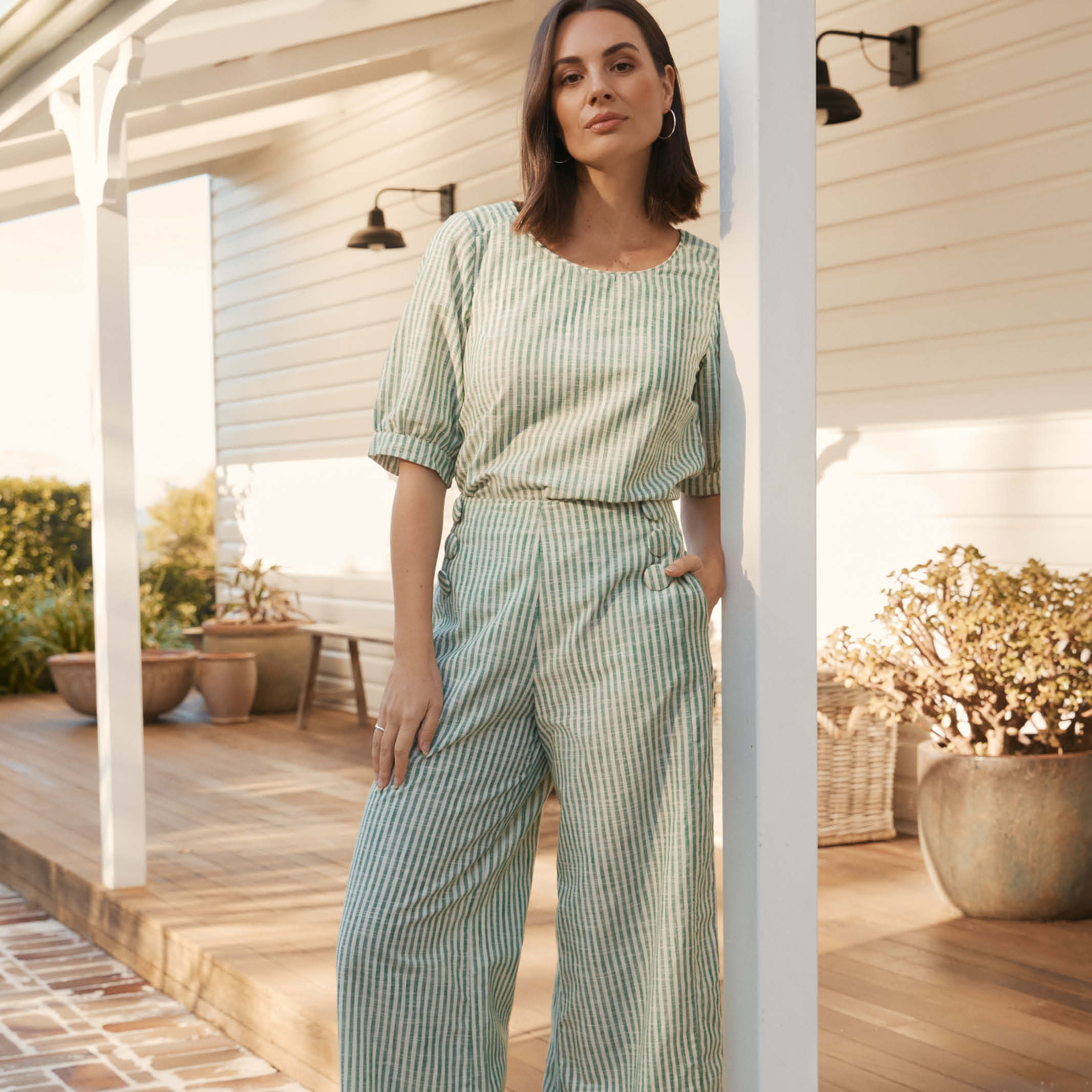 100% yarn-dyed cotton in a crisp green and white stripe. Charming and sweet, this breezy fabric brings a playful freshness to summer and is available in a range of flattering cuts across the Flores collection.