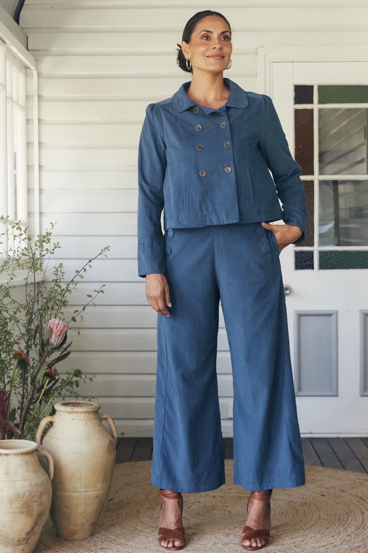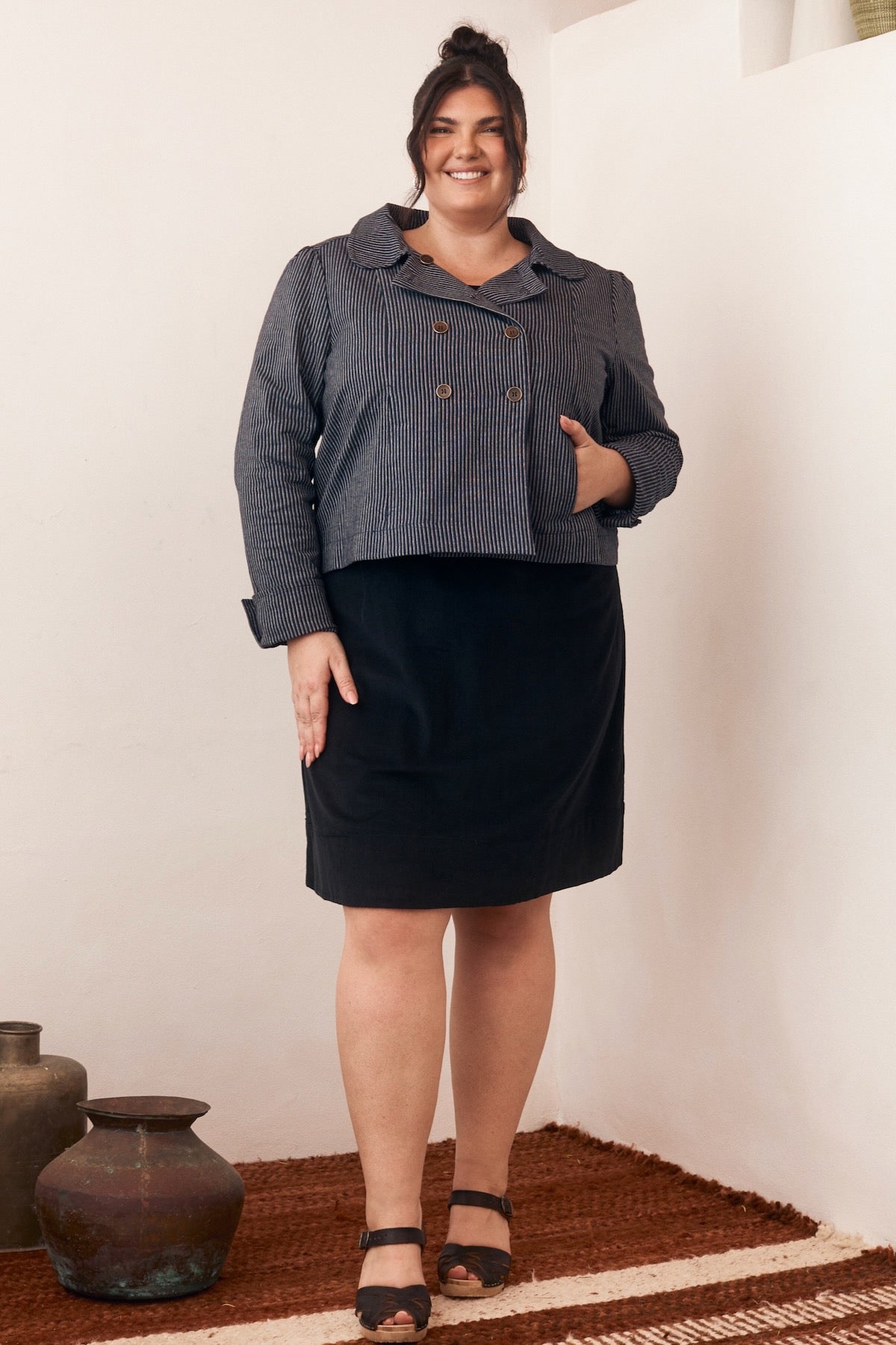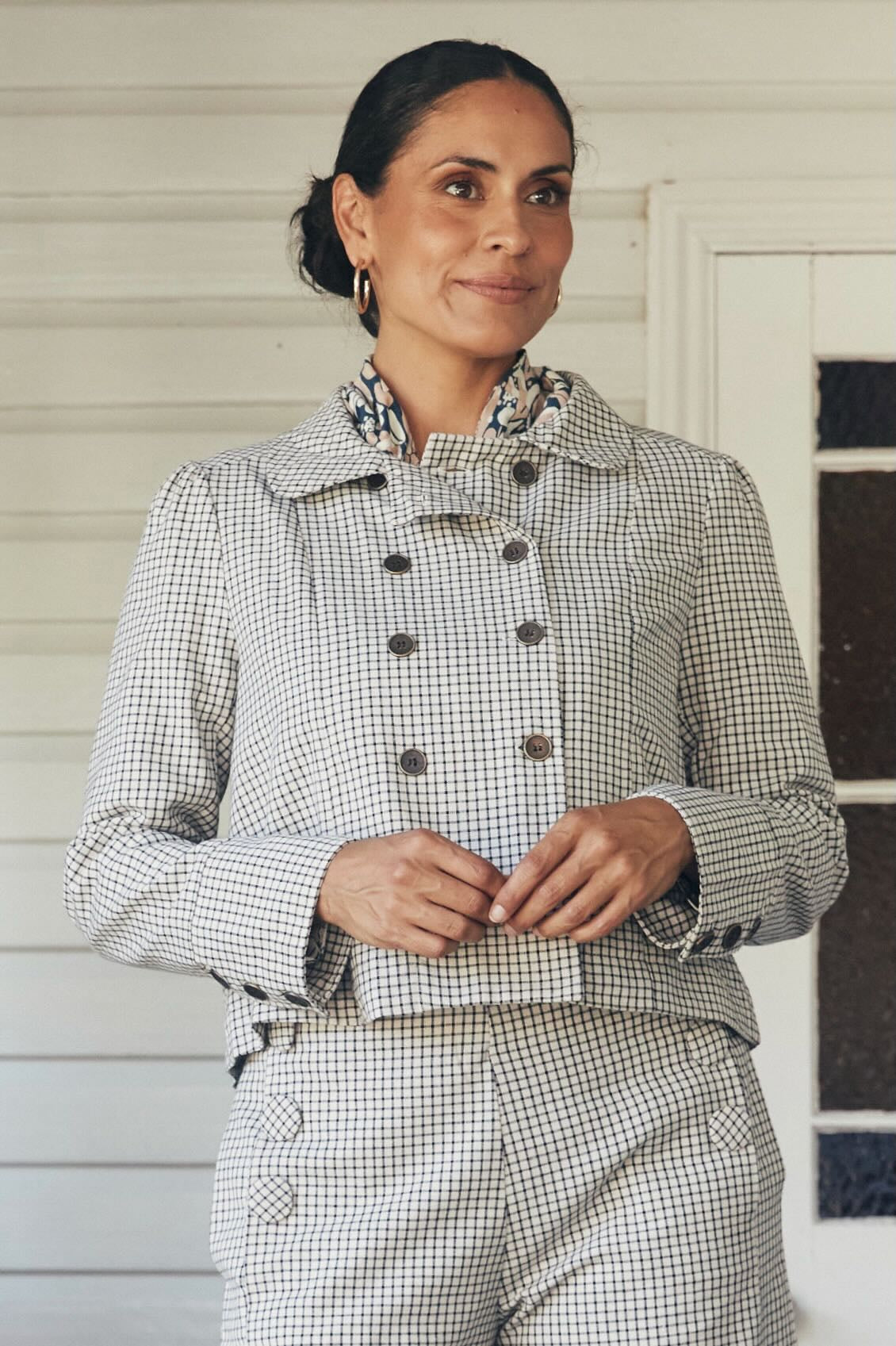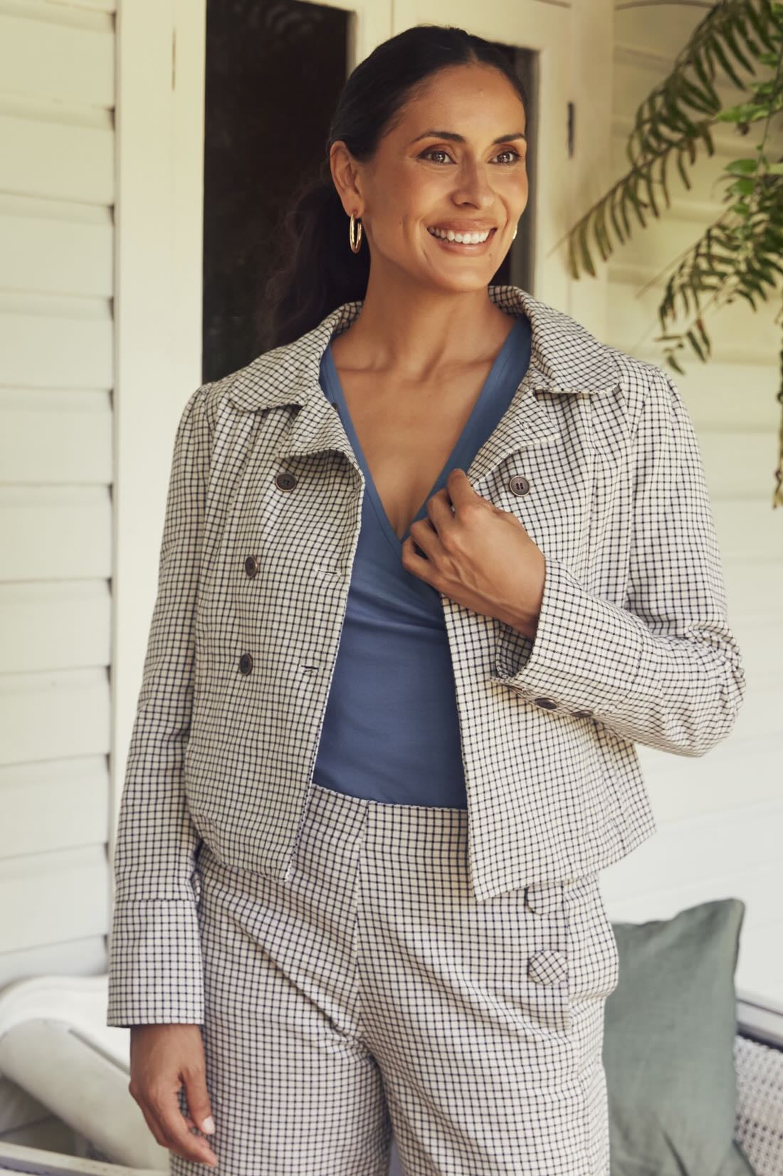 Try our double-breasted style with a tucked-in blouse and straight-leg trousers. Our cropped jacket paired with a high-waisted skirt or shift dress also works well in these settings.