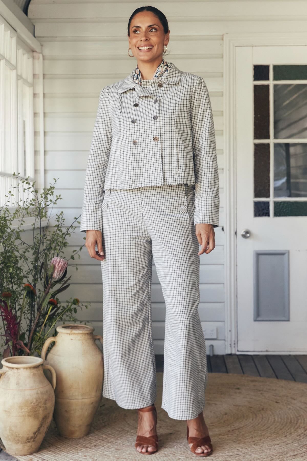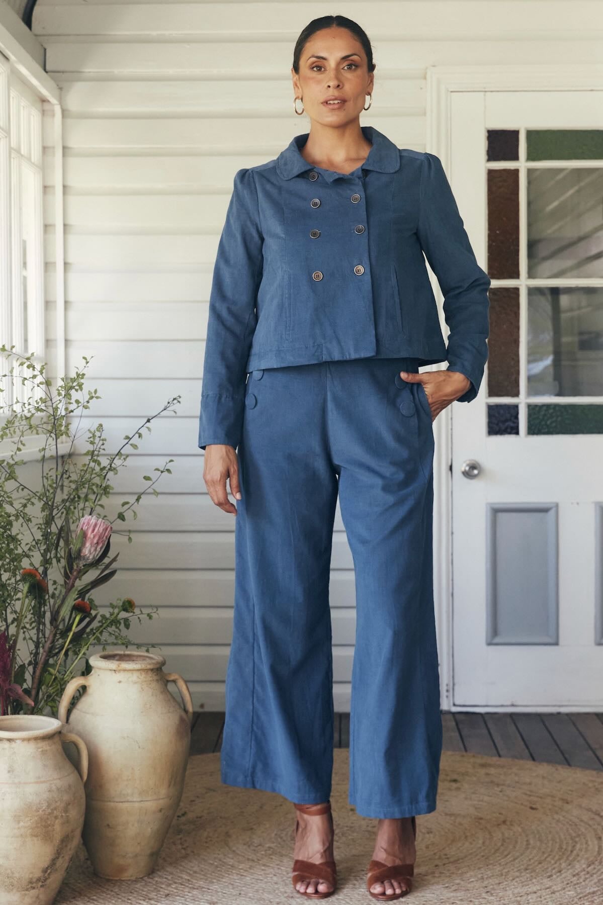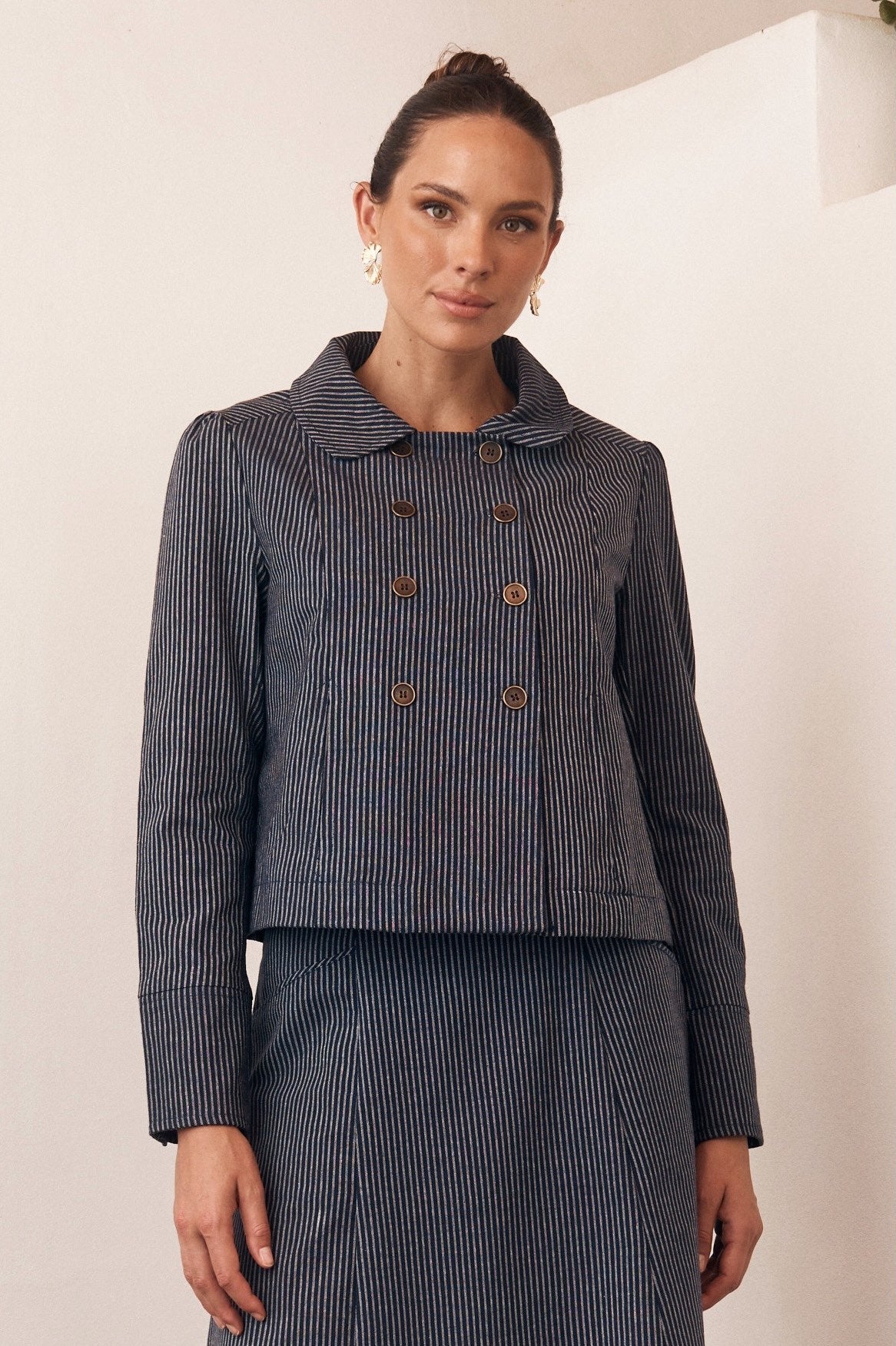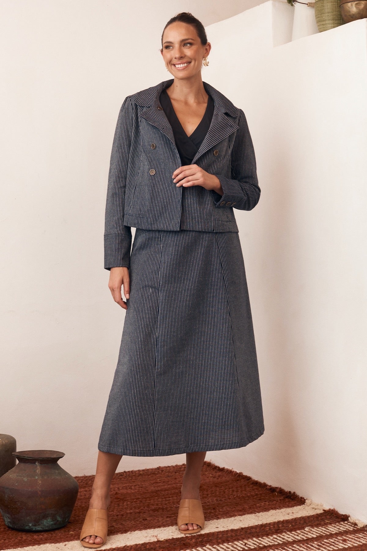 Try our double-breasted style with a tucked-in blouse and straight-leg trousers. Our cropped jacket paired with a high-waisted skirt or shift dress also works well in these settings.