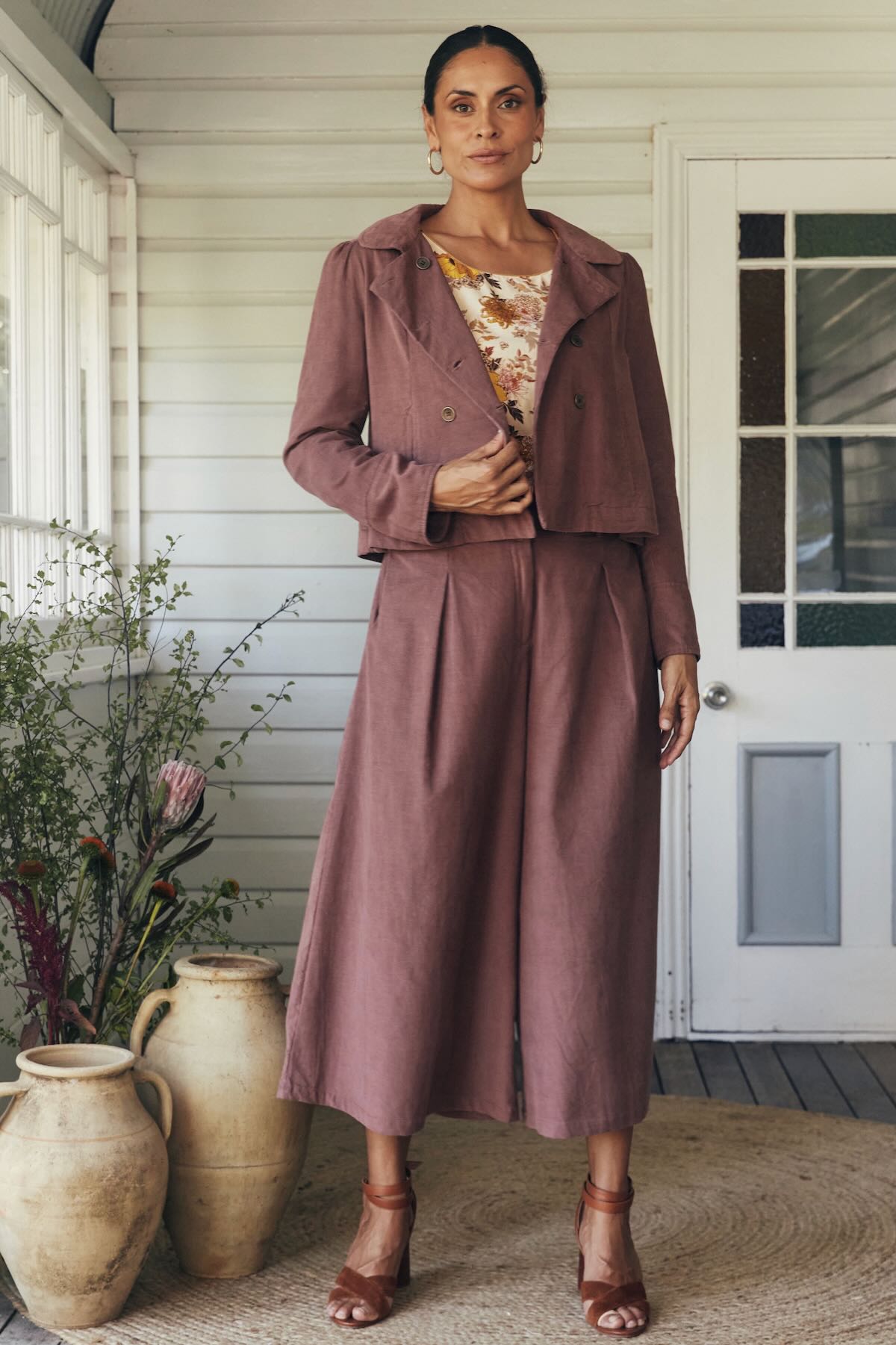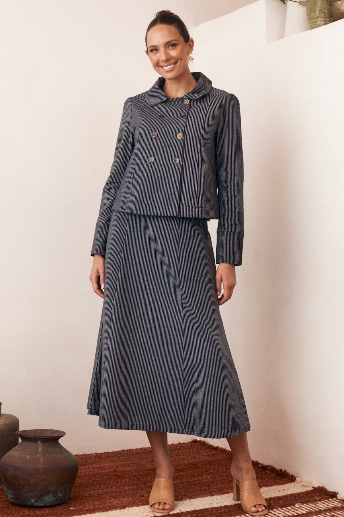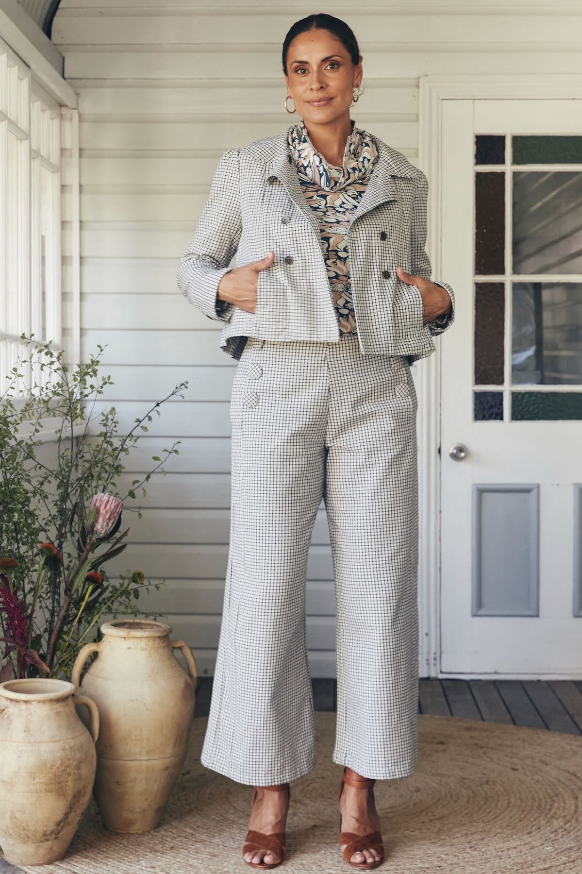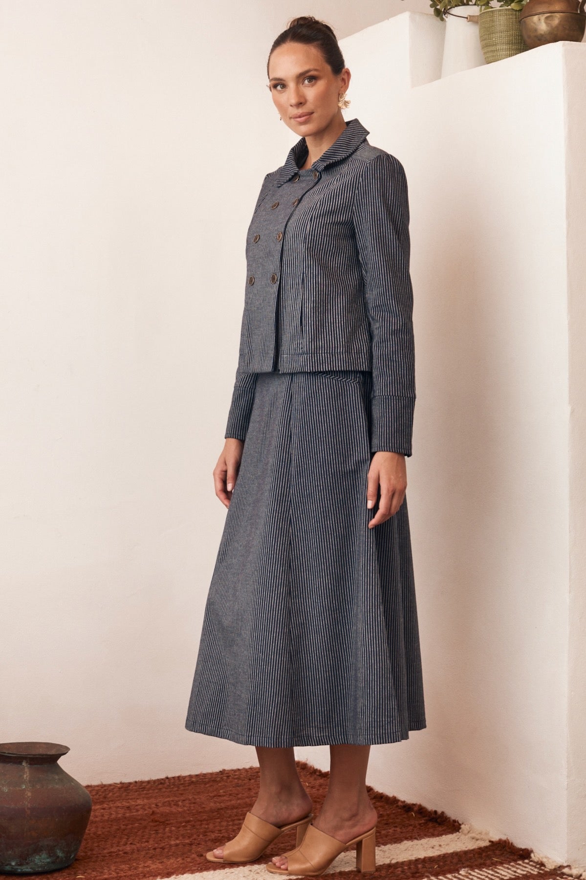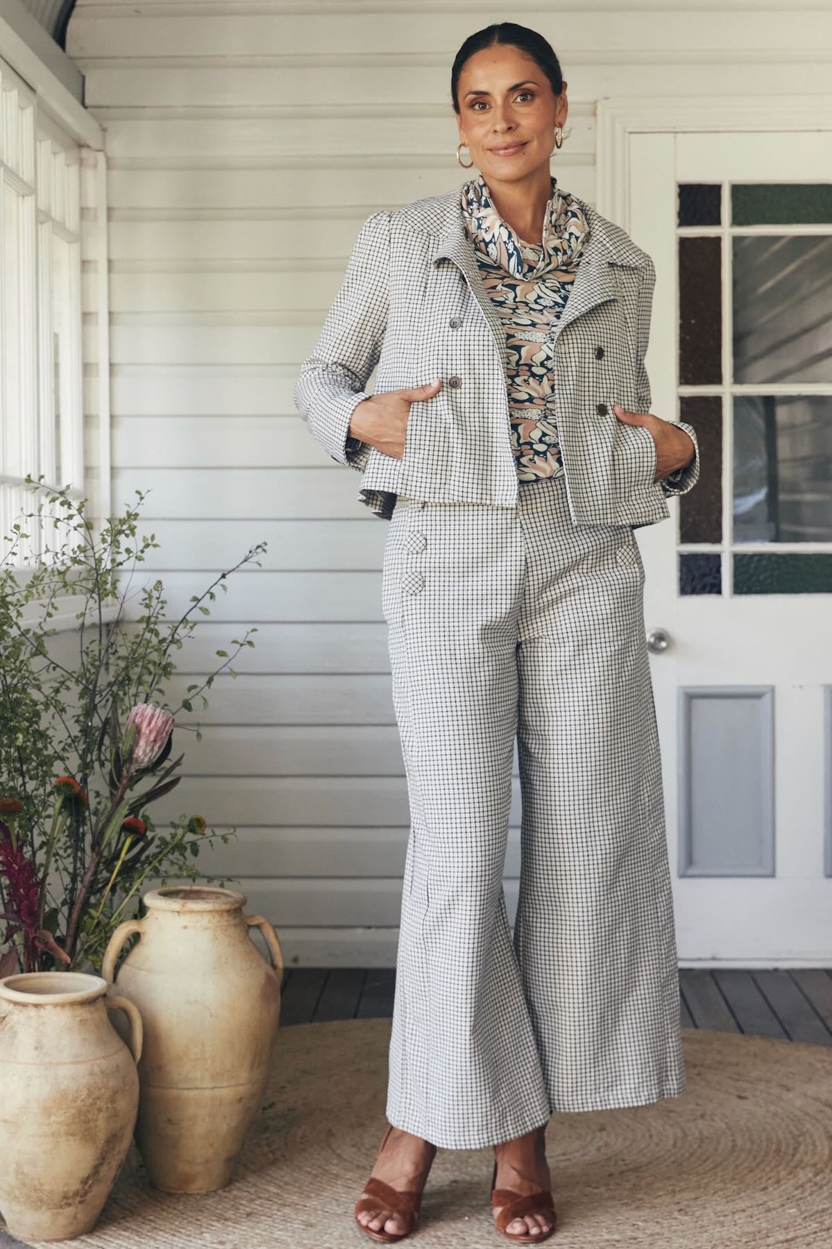 Try our double-breasted style with a tucked-in blouse and straight-leg trousers. Our cropped jacket paired with a high-waisted skirt or shift dress also works well in these settings.