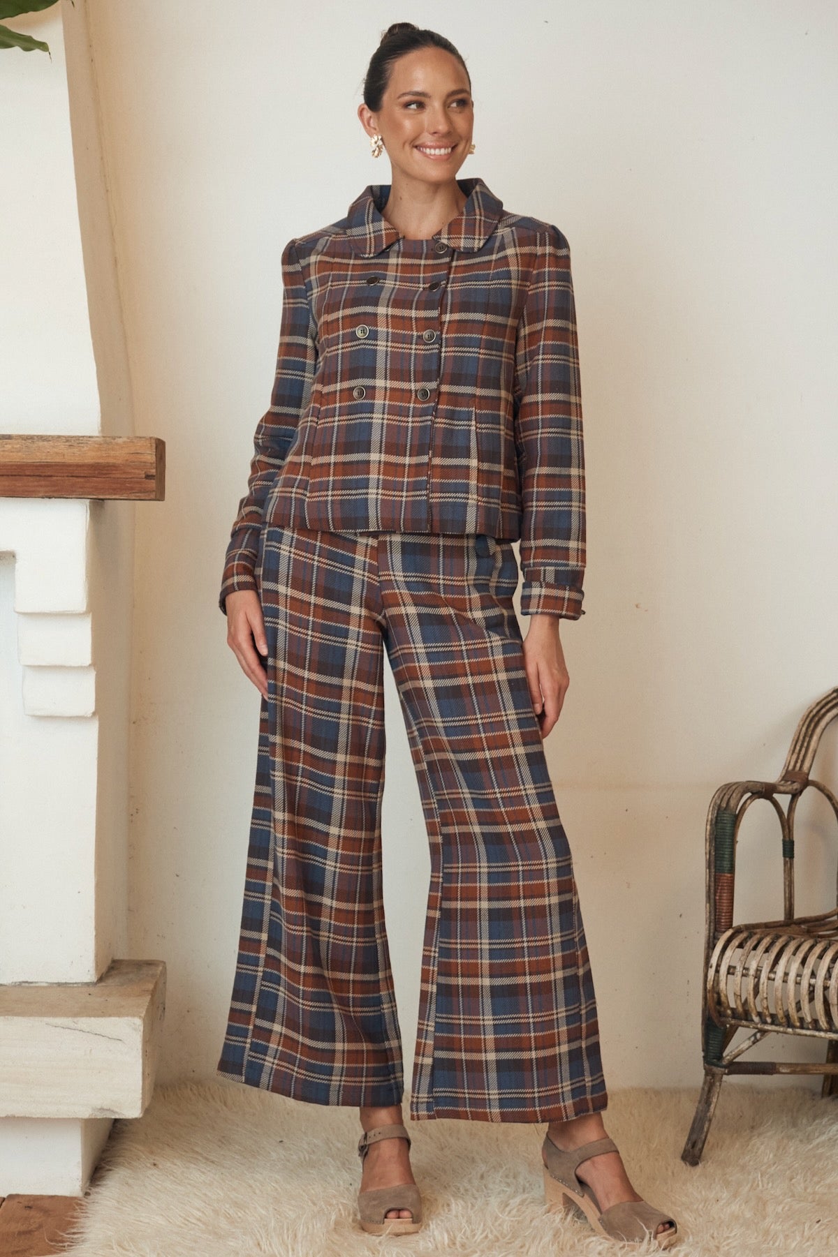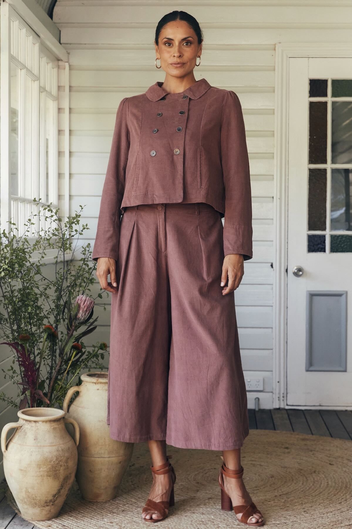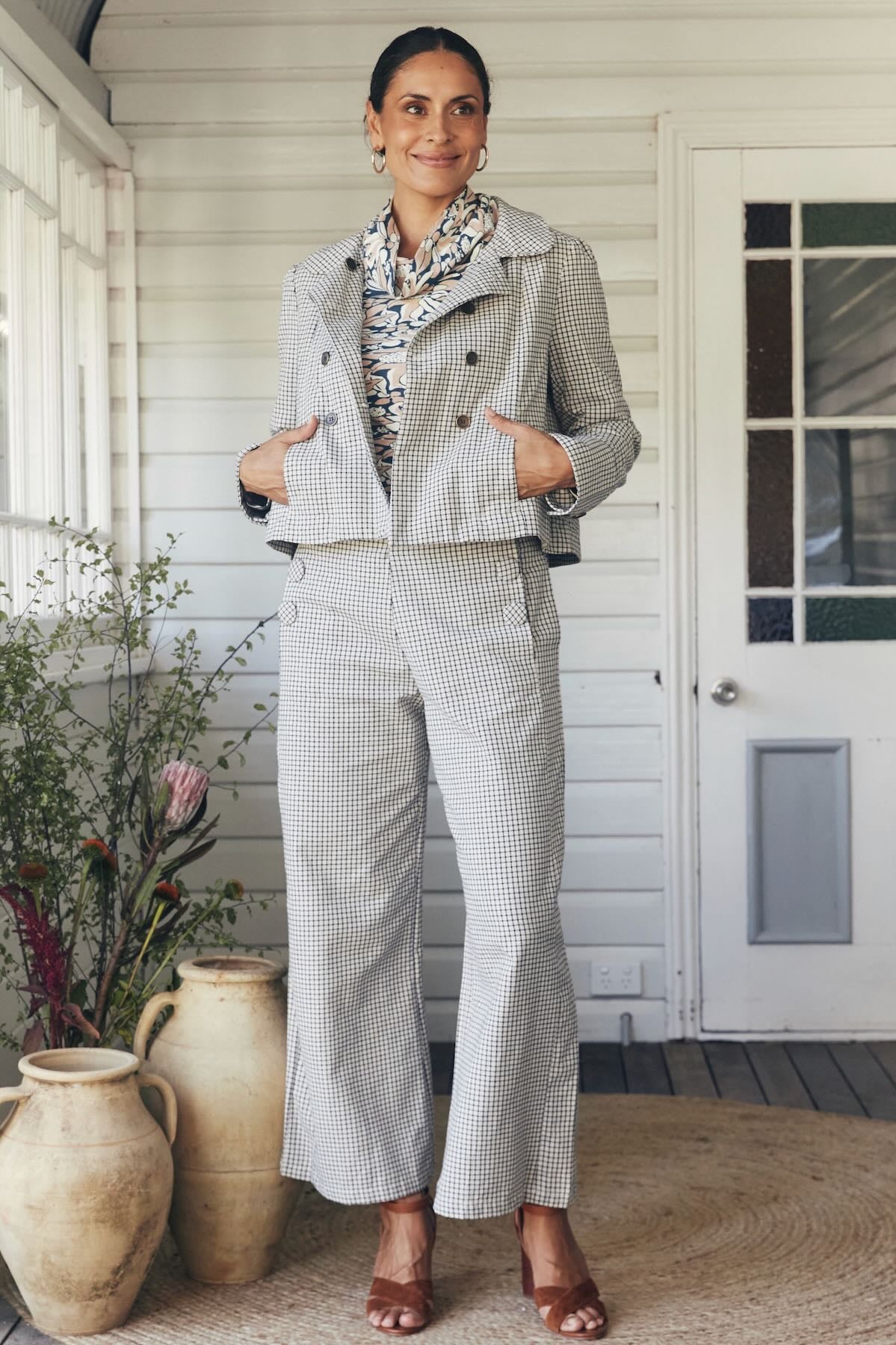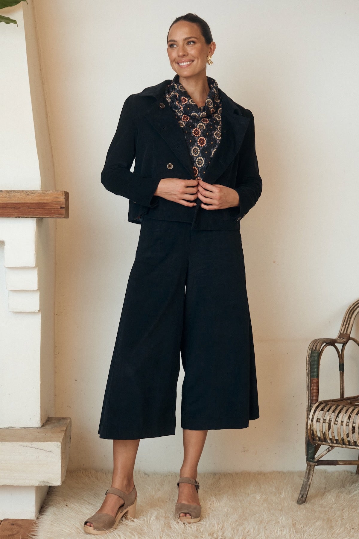 Try our double-breasted style with a tucked-in blouse and straight-leg trousers. Our cropped jacket paired with a high-waisted skirt or shift dress also works well in these settings.