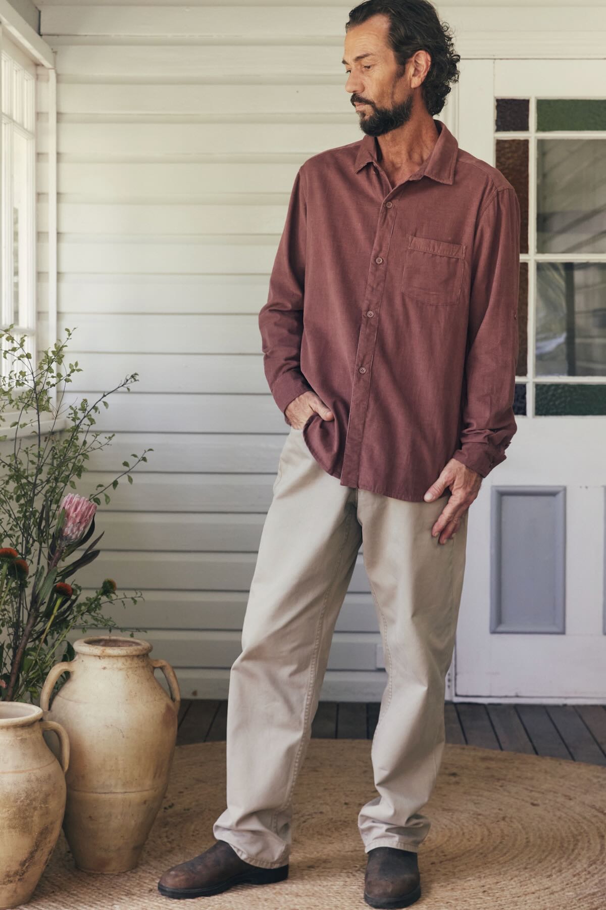 For days when the dress code is relaxed but still calls for something stylish, reach for one of our men’s long-sleeve shirts. Our navy (ocean blue) is a go-to for the everyday office rhythm, while clove feels more considered for social parts of the job. Pair with dark chinos or well-fitted trousers and brown lace-ups for a smart finish.