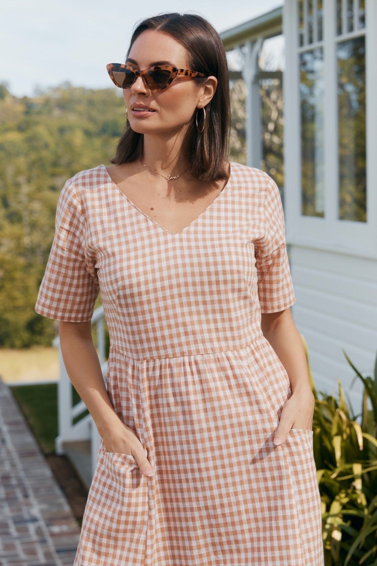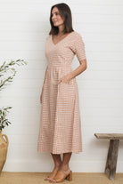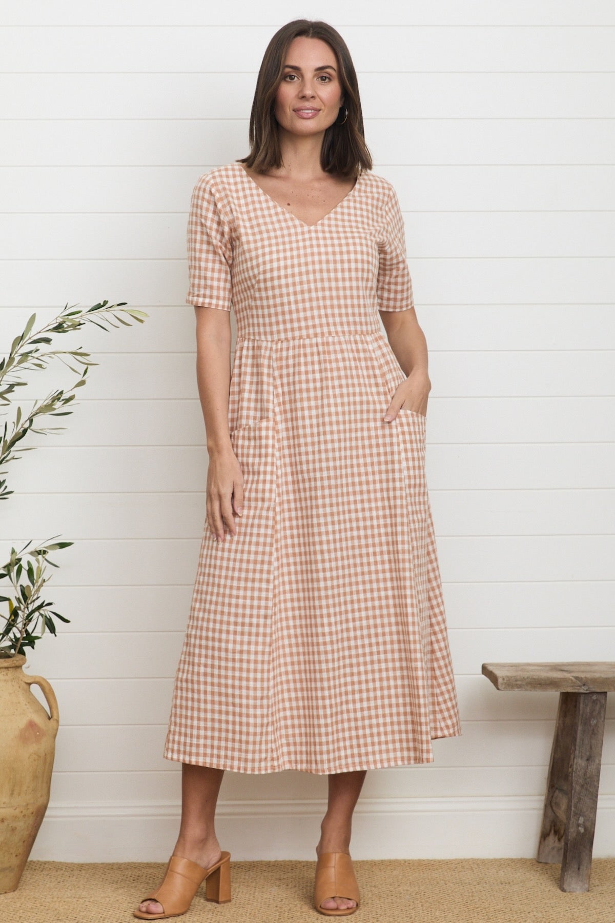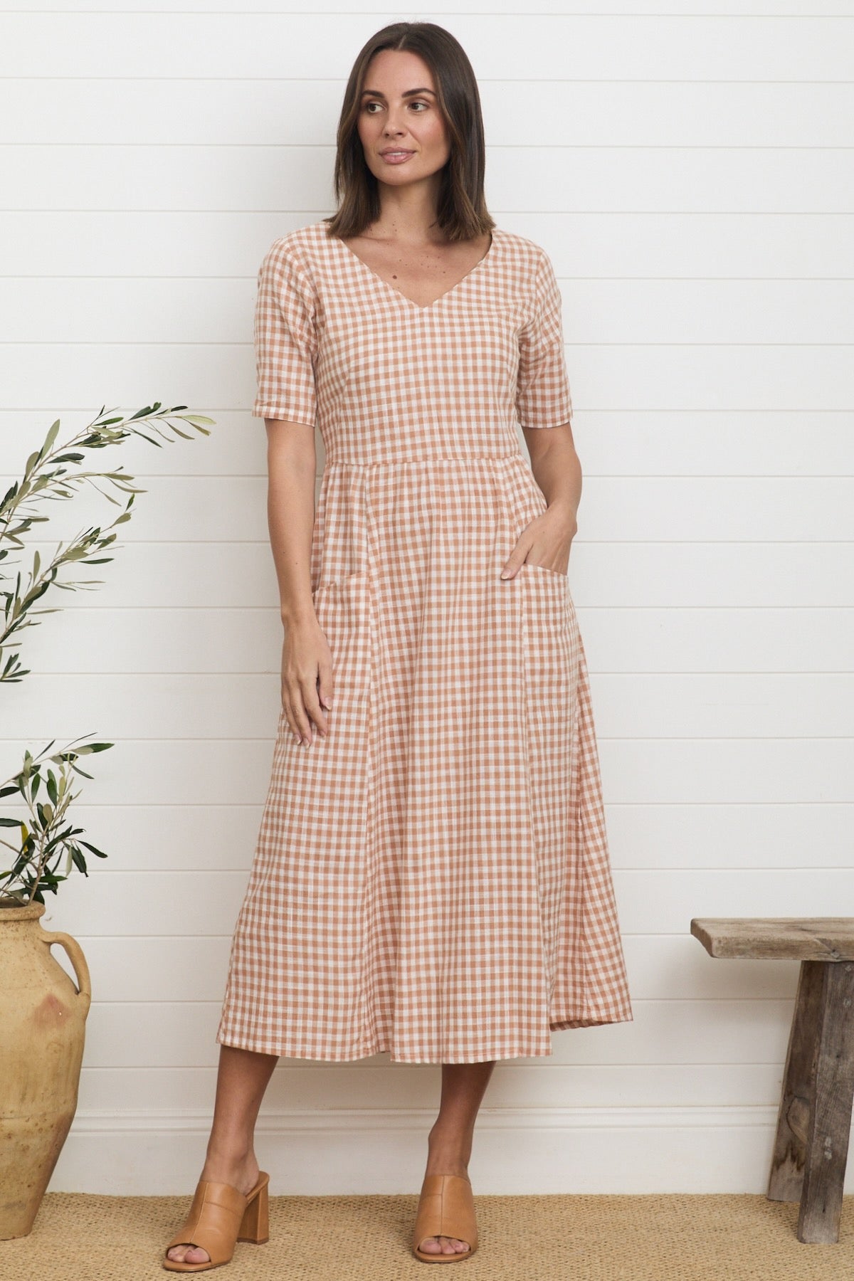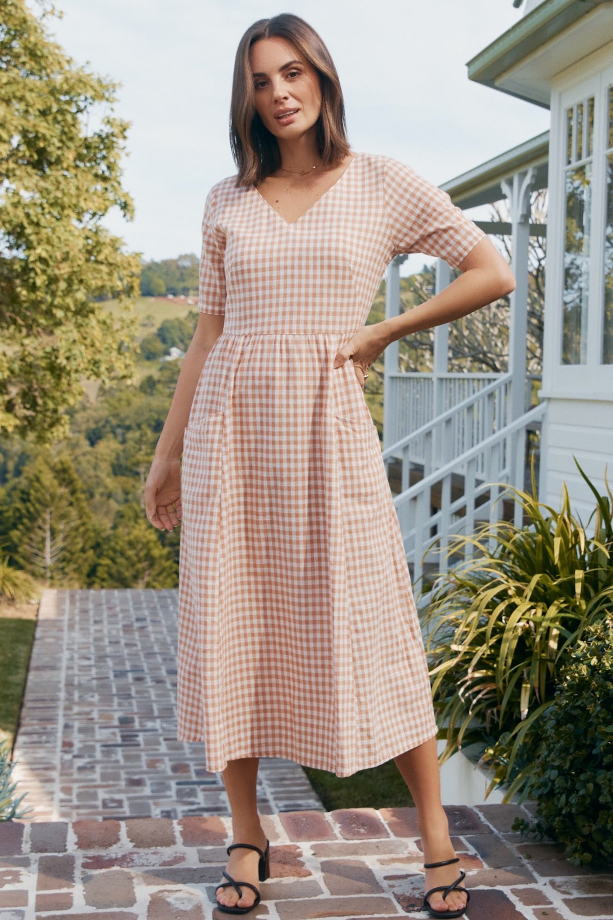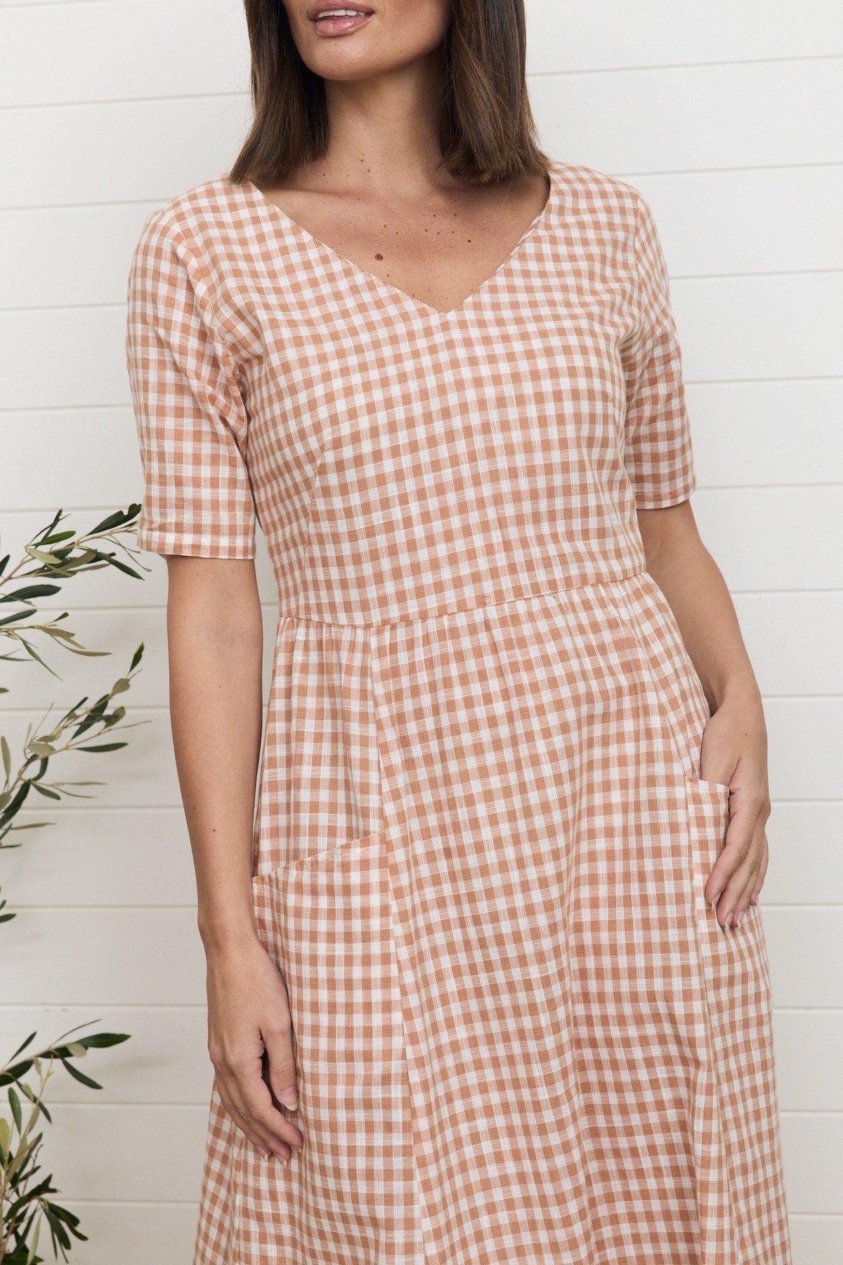 Fall in love with our Alice Dress, a perfect blend of elegance and ease. This Midi dress features a flattering V-neckline and a fitted bodice that gracefully transitions into a flared skirt, creating a timeless and feminine shape.