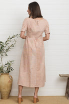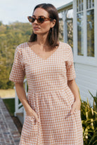 The thoughtful design includes a discreet side zipper and a charming button closure at the back for a refined fit. Short sleeves add a touch of versatility, with a button detail that allows you to adjust them for a more tailored look. Complete with front pockets, the Alice Dress is a stylish choice that blends functionality with sophistication.
