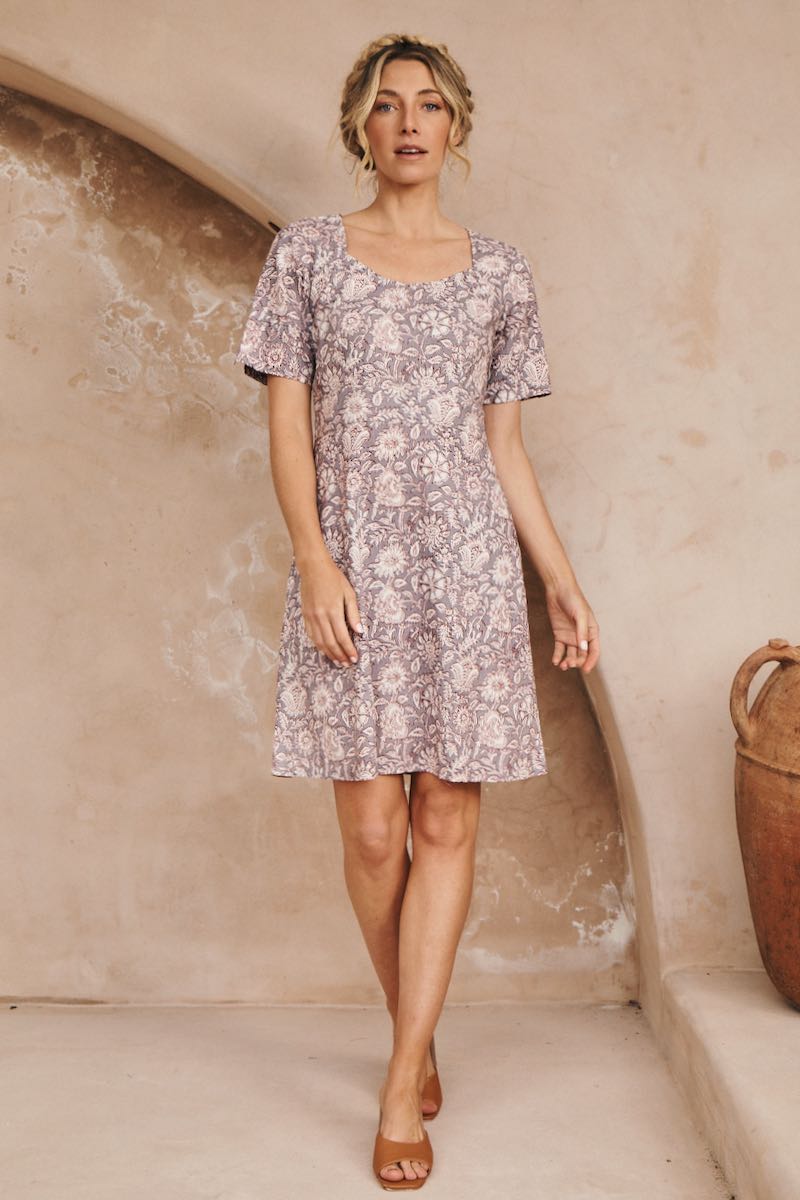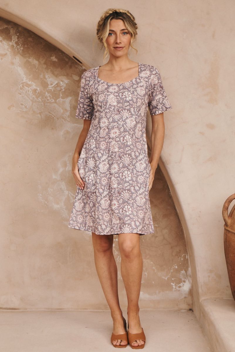 To check sizing, lay a similar garment flat and measure, be sure to double bust, waist, and hip measurements to match ours.