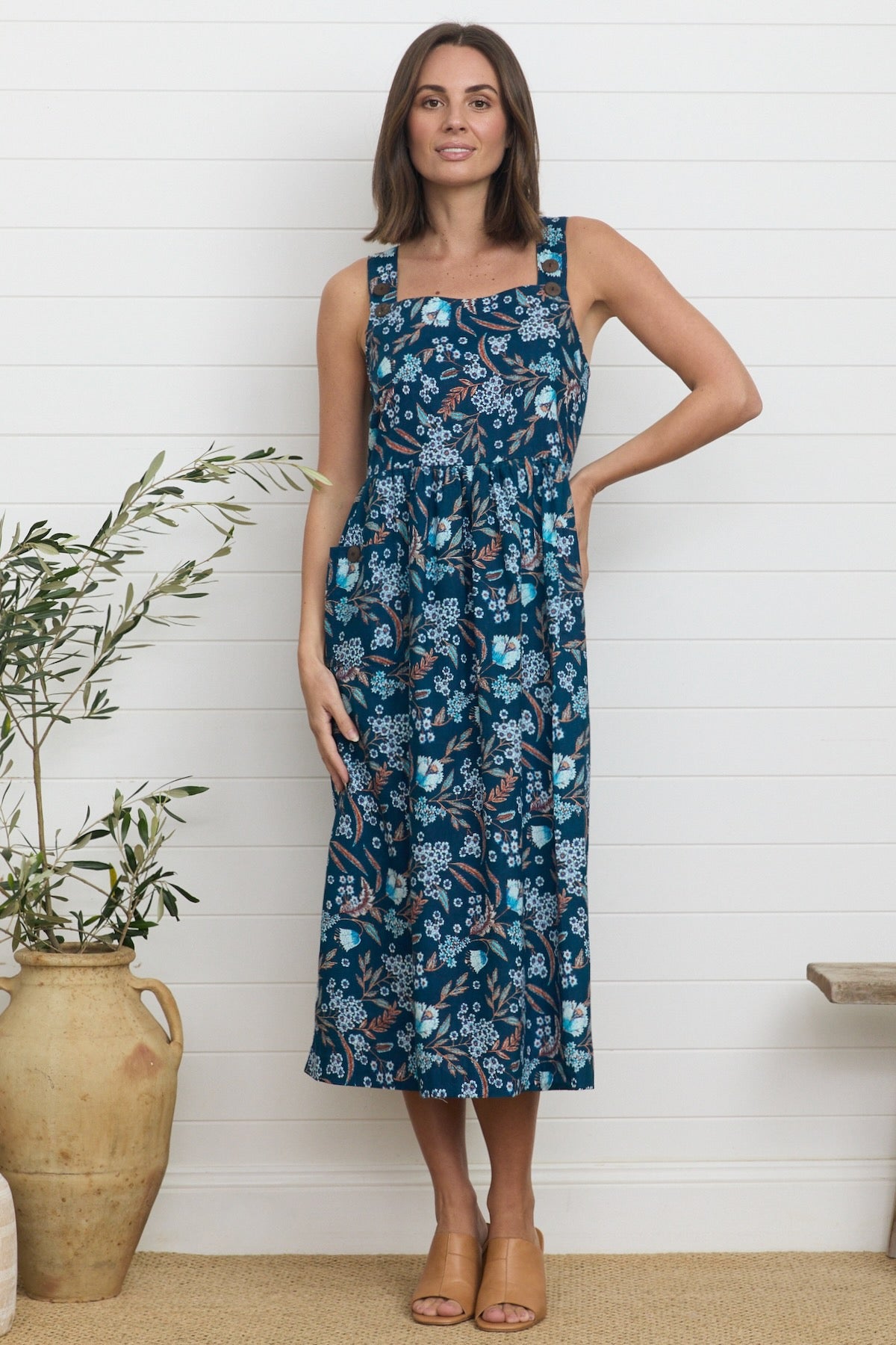 The Eadie Dress brings effortless charm to your wardrobe with its pinafore-style design and relaxed fit. Featuring adjustable straps with three buttons, a flattering square neckline, and a flared skirt, it’s the perfect blend of style and comfort. The midi length and front button-up pockets make it both practical and playful. Layer it with your favourite tops for year-round versatility and timeless appeal.
