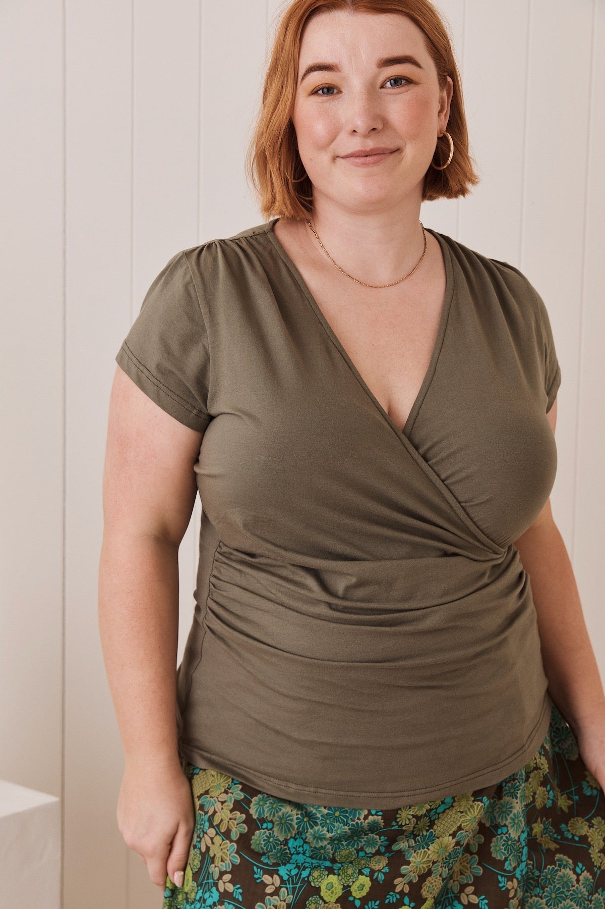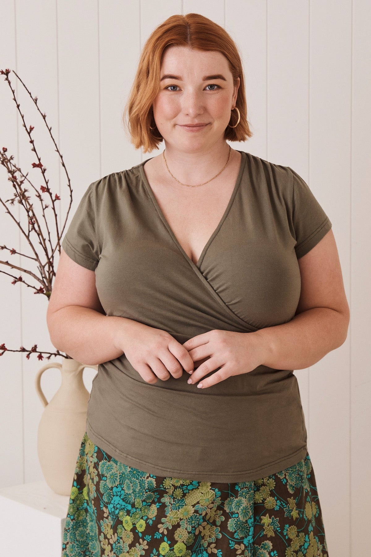 To check sizing, lay a similar garment flat and measure, be sure to double bust, waist, and hip measurements to match ours.